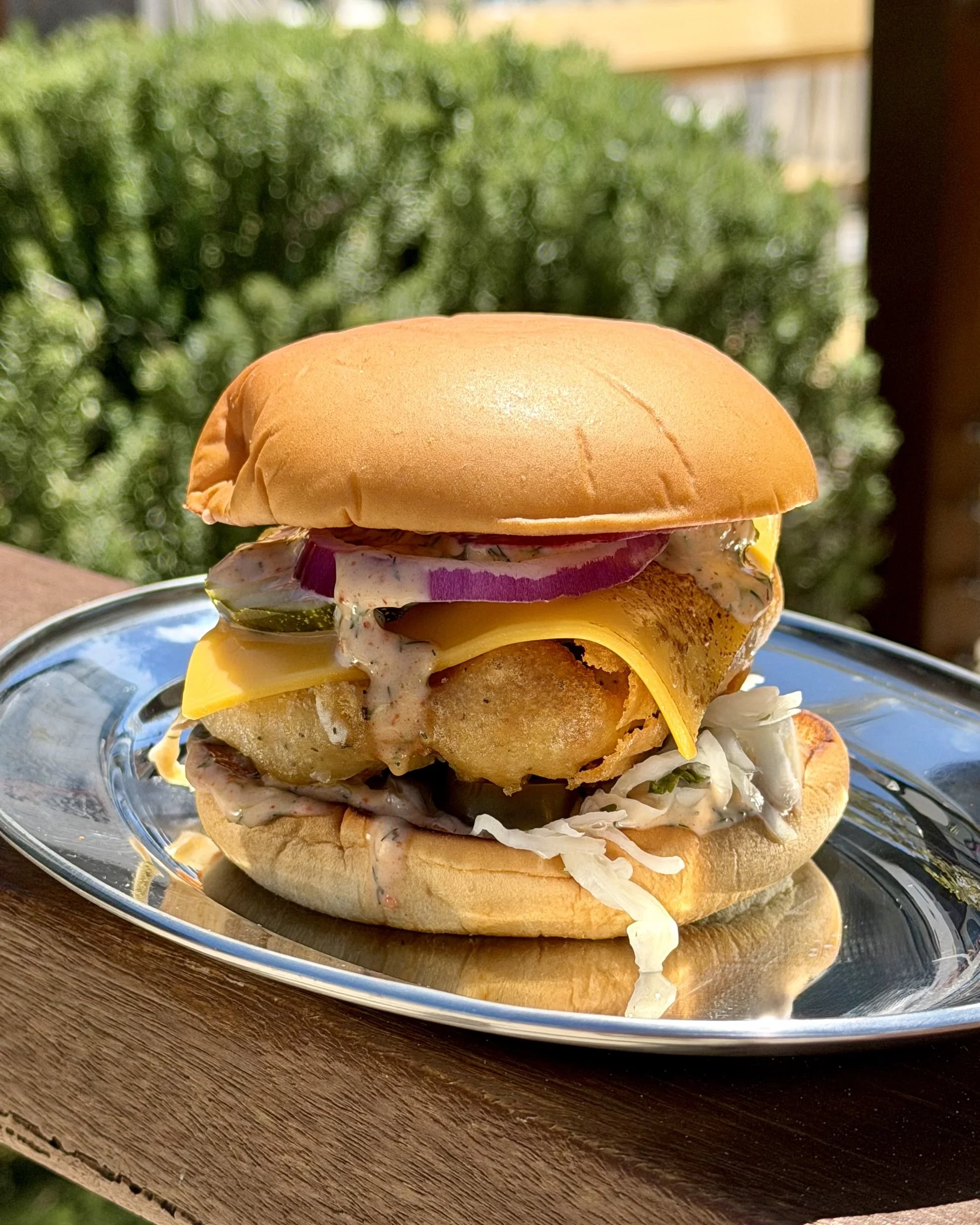 Battered fish, tartare, slaw, pickles, red onion, cheese, all on a Martin’s Potato Roll.
